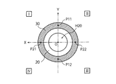 続いて、ここでは、§1で述べた基本構造部にトルクが作用した場合、各部がどのように変形するかを考えてみる。図16は、図11に示す基本構造部をXY平面で切断し、図11の左方向から見た断面図である。なお、この図16に示されたXY座標系は、通常のXY座標系を裏側から見たものになる(X軸正方向は図の左方向になる)。したがって、このXY座標系では、左上領域が第1象限、右上領域が第2象限、右下領域が第3象限、左下領域が第4象限になる。図示のI〜IVは、この座標系の各象限を示すものである。図16にハッチングを施した断面部分は、環状変形体30の部分に相当し、その奥に、右側支持体20が見えている。図16の点P11〜P22は、図13および図15に示した各接続点P11〜P22のXY平面上への正射影投影像である。