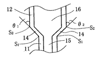 次に、第1振動部と第2振動部と接続部分との関係について詳述する。図4には、音叉腕10の溝15を備えた第1振動部11と溝16を備えた第2振動部12と接続部分14の平面図の拡大図を示す。左側の接続部分14と第2振動部12の間には角度θ1を、右側の接続部分14と第2振動部の間には角度θ2を持って接続部分14と第2振動部12は形成されている。本実施1に係わる形態では、角度θ1と角度θ2は化学的エッチング加工できる任意の値を持つが、好ましくは、角度θ1と角度θ2はθ1、θ2≦90°の関係を満たすように形成される。さらに、角度θ1側で、圧電効果により接続部分が第1振動部と第2振動部と同じ方向の第1歪を引き起こし、かつ、角度θ2側で、圧電効果により接続部分が第1振動部と第2振動部と同じ方向の第2歪を引き起こし、第1歪と第2歪の方向が反対のときには、θ1、θ2<30°の関係が好ましいが、より好ましくは、θ1、θ2≦20°の関係を満たすよう形成される。なお、第1振動部11の一端部(第1端部)と接続部分14の一端部(第1端部)が接続する点をS1で示し、第2振動部12の一端部(第1端部)と接続部分14の他端部(第2端部)が接続する点をS2で示す。同様に、音叉腕20については、音叉腕10を音叉腕20に、溝幅15、16を溝幅25,26に、第1振動部11を第1振動部21に、第2振動部12を第2振動部22に、接続部分14を接続部分24にそれぞれ置き換えることによって、音叉腕20の関係が得られる。また、角度θ1と角度θ2は音叉腕10と同じ関係を有する。