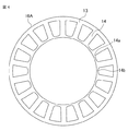 固定子鉄心3は、連結部14bを有するコアシート16A(図4に示す)と、連結部14bをもたないコアシート16B(図5に示す)を積層して構成されており、連結部14bを有するコアシート16Aと連結部14bをもたないコアシート16Bが交互に配置されている。回転子鉄心11は、磁石保持部20を有する磁極部ユニット19A(図7に示す)と、磁石保持部20をもたない磁極部ユニット19B(図8に示す)を積層して構成されている。