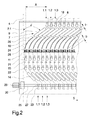 前記加熱装置(9)は、最小間隔(H)をもって互いに平行に並んで配置されており、該最小間隔(H)は、互いに隣接している前記加工箇所(1.1,1.2,1.3)の間における位置間隔(S)よりも小さいことを特徴とする、テクスチャリング加工機。 - 前記冷却装置(10)は該当する加工箇所(1.1,1.2,1.3)において、湾曲した冷却レール(24)によって形成されている、請求項1記載のテクスチャリング加工機。