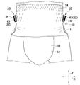 (3)前記テープタブは、前記近位部と前記遠位部との間に位置する中間部をさらに有し、前記近位部は、前記側部シーム域に固定された第1近位部と、前記第1近位部の横方向の内側においてそれと離間して位置する第2近位部とを有し、前記中間部において、前記第1近位部と前記第2近位部との間に位置する、前記第1ウエスト域の側縁部に非固定の離間部分は、前記第1及び第2ウエスト域の収縮状態において、前記厚さ方向の外側へ凸曲した形状を有する。