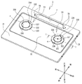 図1および図2を参照して、こんろ1の構造について説明する。図1および図2に示すように、こんろ1は、器具本体を構成する筐体2と、トッププレート3を備える。筐体2は、金属製であって、上面に開口部(図示せず)を備えた略直方体状に形成されている。筐体2の内部には、左右一対のガスバーナ5,5が配置されている。トッププレート3は、板金をプレス加工することで形成される。トッププレート3の少なくとも上面には、煮こぼれした液体等による汚れの固着を防止するため、ホーローによるコーティングが施されている。トッププレート3は、筐体2上面の開口部を閉塞して、筐体2の上部に固定されている。トッププレート3には、左右一対の略円形のバーナ開口4,4が形成されており、トッププレート3が筐体2の上部に設置されることで、ガスバーナ5が筐体2側から上方に突出して、各バーナ開口4の中央に臨む。ガスバーナ5,5の各周囲には、五徳50,50がそれぞれ配置されている。五徳50,50の各上部には、鍋、フライパン等を含む調理器具等の被加熱物(図示せず)が載置される。