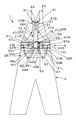第1本体部31Aと第2本体部32Aの下端部の先端部には、それぞれ第2スナップボタンS2の凹部35を取り付けている。後身頃21の臀部26に対応する位置に上方が開口した下部取り付け部材であるポケット部37が配置され、第2スナップボタンS2の凹部35が係合する第2スナップボタンS2の凸部36を幅方向の中央を境にして左右対称にポケット部37内に設けている。第1本体部31Aと第2本体部32Aの上部は、筒状の例えば布製のホルダー38内に挿通され、幅方向外側への移動を防止される。
