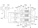 図7に示す配線パターンも、図6の配線パターンと同様、破線A−Aより紙面左側の領域が駆動回路配線104であり、破線B−Bより紙面右側の領域が主回路配線105であり、破線A−Aと破線B−Bとの間の領域が共通配線の一部であり、共通配線106である。パワーモジュール10の低電圧側入力端子64、65、66は、それぞれ分離された共通配線106a、106b、106cにはんだ付けなどにより接続され、低電圧側入力端子64は駆動回路配線104aに、低電圧側入力端子65は駆動回路配線104bに、低電圧側入力端子66は駆動回路配線104cにそれぞれ接続されている。駆動回路配線104a、104b、104cは、共通の駆動回路配線104に接続されて基準電位接続点8に接続されるが、駆動回路配線104a、104b、104cのそれぞれにはインピーダンス素子11a、11b、11cが設けられている。また、低電圧側入力端子64、65、66は、それぞれ主回路配線105a、105b、105cに接続された後、共通の主回路配線105に接続される。