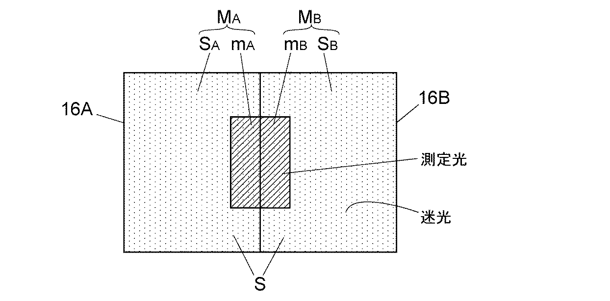 により求めることができる。上記式を用いることで、両受光領域のそれぞれに入射した純粋な測定光に由来する検出信号値(MA−SA)、(MB−SB)によってRI値が算出されるため、迷光成分値SA、SBによる影響をより確実に排除して、示差屈折率検出器の検出感度及び検出精度をより向上させることができる。