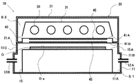 そして、ランプハウス21の内部、すなわちランプ室S2には、複数(図1の例においては5本)の棒状の紫外線ランプ30が、光透過窓部材40に対向して配設されている。これらの複数の紫外線ランプ30は、中心軸が光透過窓部材40に平行な同一水平面内において互いに平行に伸びるよう一定の間隔(図1においては等間隔)で並列している。これらの複数の紫外線ランプ30には、冷却手段(図示省略)が設けられている。ここに、冷却手段は、空冷ブロックまたは水冷ブロックよりなり、紫外線ランプ30を250℃以下に冷却することのできるものである。紫外線ランプ30を冷却する冷却手段が設けられていることにより、紫外線ランプ30が過熱されることに起因して生じる弊害の発生をより一層抑制することができる。具体的には、発光管(具体的には、発光管を構成するガラス)の紫外線透過率(具体的には、真紫外線透過率)の低下を抑制することができ、また、特に紫外線ランプ30としてエキシマランプを用いた場合には、エキシマ分子が乖離することに起因する発光効率の低下を抑制することができる。また、ランプ室S2には、載置台15に載置された被処理物Dの被処理面Daに対して、複数の紫外線ランプ30からの光(真空紫外線)を有効に利用して均一照射することができるよう、当該複数の紫外線ランプ30の上方に、共通の反射ミラー31が配設されている。また、ランプハウス21には、ランプ室S2において複数の紫外線ランプ30からの真空紫外線が大気(酸素)に吸収されることのないように、例えば窒素ガスなどの不活性ガスによって当該ランプ室S2の内部をパージするパージ手段(図示省略)が設けられている。