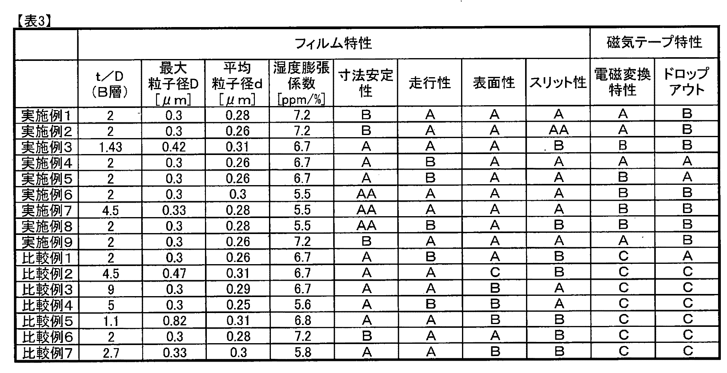 以下、表に各実施例、比較例の原料組成、製膜条件、二軸配向ポリエステルフィルムの物性、磁気テープの特性等を示す。