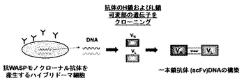 (1)ヒトやマウスの免疫細胞において、シグナル伝達分子として機能することが知られているWiskott−Aldrich syndrome protein(WASP)に特異的なモノクローナル抗体を産生するハイブリドーマから全RNAを抽出し、SMARTTM RACE cDNA amplification kit(Clontech社)を用いて5’−RACE法によりモノクローナル抗体のH鎖及びL鎖の可変部(VH,VL)の遺伝子をクローニングした。VH及びVLのDNAフラグメントをフレキシブルなリンカー配列(GGGGS×3)を介して結合した一本鎖抗体(scFv)を構築した(図1)。