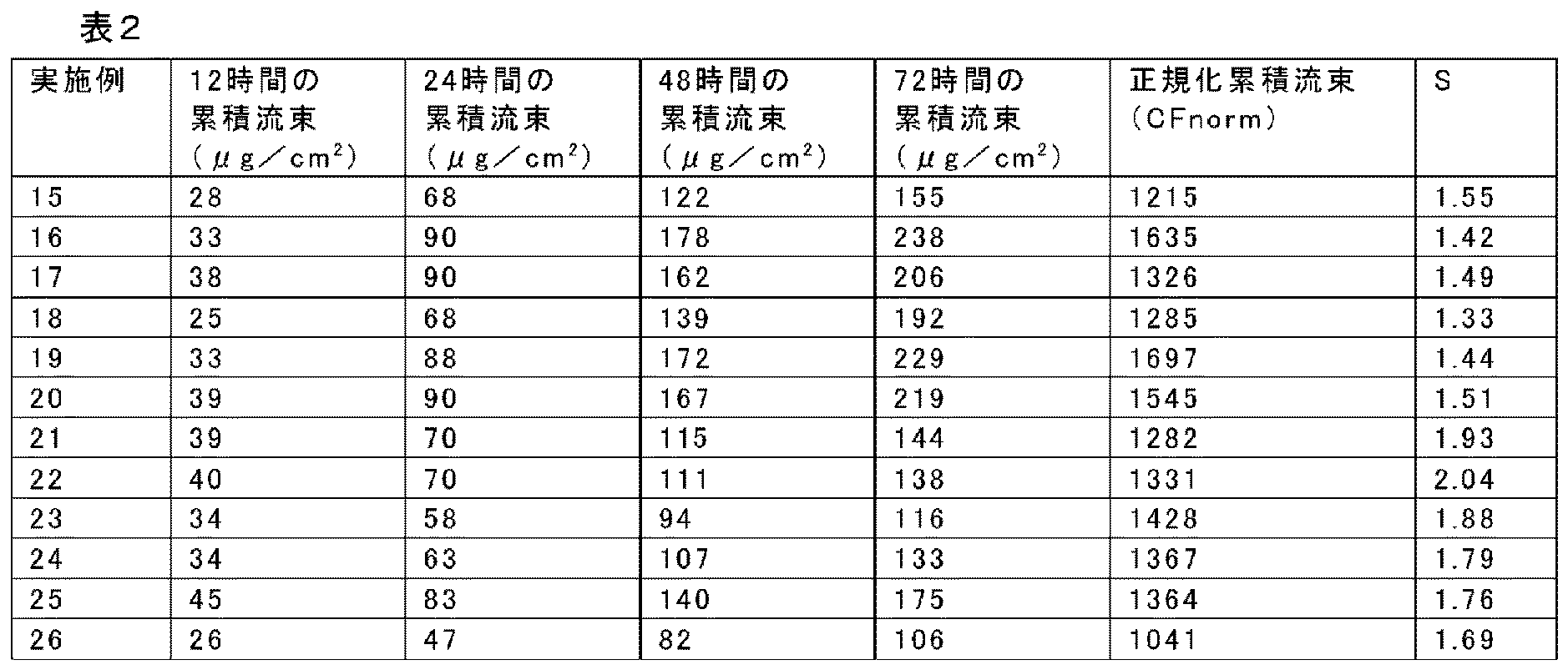 (式中、72時間×ピーク流束は72時間の透過試験中のピーク流束であり、μg/cm2/時の単位で測定され、累積流束は72時間全体にわたり、μg/cm2の単位で測定される)によって示される。仮にピーク流束が72時間全体にわたって維持された場合には、形状係数は1.0となる。そうでない場合には、72×(ピーク流束)が72時間にわたる累積流束よりも大きくなるため、形状係数は1よりも大きくなる。本開示による薬物送達デバイスの形状係数は、「DURAGESIC」パッチ(リザーバー型又はマトリックス型のいずれか)の形状係数と類似であることが望ましい。この形状の類似性は、生物学的同等性試験では、比較対象の製品のCmax(最高血漿中濃度)及びAUC(血漿曲線下面積)の両方が一致する(信頼区間の80〜125%以内)必要があるため、重要である。Cmax及びAUCは、一般にパッチのサイズを調整することにより直接調整することができるが、これらは互いに一致して変化する。送達形状のピークが鋭すぎるか、又は平坦すぎる場合には、Cmax及びAUCの両方を同時に一致させるのはより困難となる。「DURAGESIC」リザーバー型の形状係数は、以下の実施例に記載の方法に従った多数の異なるロットの死体皮膚についてのいくつかの透過性試験による流束データの平均を取ることにより、1.81と測定された。例えば、いくつかの実施形態において、形状係数は1.3〜2.2、1.4〜1.9、1.5〜1.9、又は1.6〜1.8の範囲である。形状係数は、パッチがどの程度素早く薬物を放出しきるかについて影響するため、ある程度、皮膚の相対的な透過性に影響される。したがって、形状係数の絶対値は、一般的には、同一のロットの皮膚で試験した対照試料(例えば、「DURAGESIC」リザーバー型)と比較すべきである。