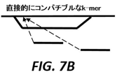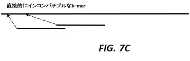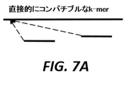 例えば図7中で示されるように、いくつかのk−merは直接的にコンパチブルであり、いくつかのk−merは間接的にコンパチブルである。両方がリファレンス配列へ属するか、または両方が同じ代替パスへ属する場合、同じ正規化されたオフセット(点線の矢印)を備えた2つのk−merは直接的にコンパチブルであり;1つがリファレンス配列へ、および他のものが代替パスへ属する場合に、それらはインコンパチブルである。図7Aは、両方のk−merが同じ正規化されたオフセットを有し、リファレンス配列へ属する例を示し、これは直接的にコンパチブルである。図7Bは、両方のk−merが同じ正規化されたオフセットを有し、同じ代替物パスへ属する例を示し、これは直接的にコンパチブルである。図7Cは、両方のk−merがリファレンス配列へ属するが、異なる正規化されたオフセットを有する例を示し、これは直接的にインコンパチブルである。図7Dは、1つのk−merがリファレンス配列へ、他のものが代替パスへ属し、両方が同じ正規化されたオフセットを有する例を示し、これは間接的にコンパチブルである。図7Eは、両方のk−merが同じ正規化されたオフセットを有するが、異なる代替パスへ属する例を示し、これは間接的にインコンパチブルである。直接的にコンパチブルなk−merは同じリファレンスパスまたは代替パスへ属し、同じ正規化されたオフセットを有する(例えば図7Aを参照)。間接的にコンパチブルなk−merはアライメントされる配列からのk−merであり、そこで、いくつかのk−merはリファレンス配列を指示し、いくつかのk−merは代替パスを指示するが、k−merのセットは同じ正規化されたオフセットを有する(例えば図7Cを参照)正規化オフセットは、コンパチブルなk−merによって支援されたリードの候補アライメントロケーションである(例えば図6Dを参照)。図8は、候補アライメントロケーション(CAL)の数を低減するオフセット正規化を例証する例示的な概略図を示す。図8Aにおいて、アライメントされるべき配列801は、各々が配列に関するその相対的なオフセットを備えたより小さなk−mer 802へと分割される。図8Bにおいて、k−mer 803の第2の群は単一の候補アライメントロケーションを形成する。
