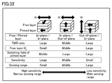 図32には、左側から順に3種の磁気トンネル接合素子が開示されている。左から1つ目の磁気トンネル接合素子においては、リファレンス層の磁化は、膜面に平行な面内方向を向いており、フリー層の磁化も、面内方向を向いている。検知する外部磁場は、リファレンス層の膜面に平行な方向に変化する。この構成では、フリー層への磁気異方性印加のために、形状異方性を用いたり、磁石もしくは電磁石によるバイアス磁場印加を要する。また、異方性磁場の方向と検出磁場の方向が90°からずれるとセンサ出力の線形性が悪化する。 FIG. 32 discloses three types of magnetic tunnel junction elements in order from the left side. In the first magnetic tunnel junction element from the left, the magnetization of the reference layer is oriented in the in-plane direction parallel to the film surface, and the magnetization of the free layer is also oriented in the in-plane direction. The detected external magnetic field changes in a direction parallel to the film surface of the reference layer. In this configuration, in order to apply magnetic anisotropy to the free layer, it is necessary to use shape anisotropy or apply a bias magnetic field by a magnet or an electromagnet. Further, if the direction of the anisotropic magnetic field and the direction of the detected magnetic field deviate from 90 °, the linearity of the sensor output deteriorates.