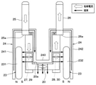 集磁ヨーク24は、消弧用磁石23の一方の磁極から発生した磁束をもう一方の磁極に導くためのものであり、軟磁性体で構成される。集磁ヨーク24は、U字型とされた板状部材で構成され、第1固定接点27および第1磁石231の周囲に配置された第1ヨーク241と、第2固定接点28および第2磁石232の周囲に配置された第2ヨーク242とを有した構成とされている。