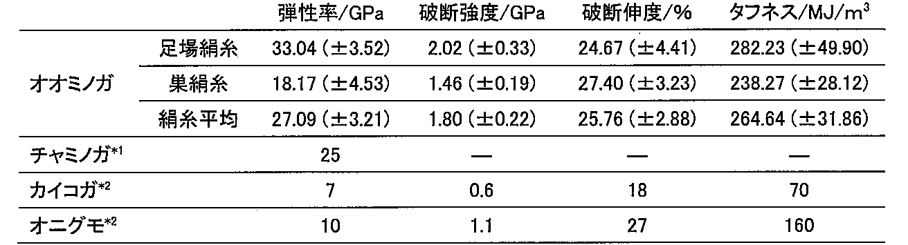算出された各力学特性値を表2に示す。この表では、対照用として参考文献から引用したチャミノガ由来のミノムシ絹糸、カイコガ由来のカイコ絹糸、及びオニグモ由来のクモ糸における力学特性値を示している。対照用の各力学特性値の算出方法は、本実施形態の各力学特性値の算出条件と同じである。