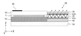 複数の導波路素子10のそれぞれは、互いに対向する第1のミラー30および第2のミラー40(以下、単にミラーと呼ぶ場合がある)と、ミラー30とミラー40の間に位置する光導波層20とを備える。ミラー30および40の各々は、第3の方向D3に交差する反射面を、光導波層20との界面に有する。ミラー30および40、ならびに光導波層20は、第2の方向(X方向)に延びた形状を有している。
