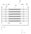 なお、後述するように、複数の導波路素子10の複数の第1のミラー30は、一体に構成された第3のミラーの複数の部分であってもよい。また、複数の導波路素子10の複数の第2のミラー40は、一体に構成された第4のミラーの複数の部分であってもよい。さらに、複数の導波路素子10の複数の光導波層20は、一体に構成された光導波層の複数の部分であってもよい。少なくとも、(1)各第1のミラー30が他の第1のミラー30と別体に構成されているか、(2)各第2のミラー40が他の第2のミラー40と別体に構成されているか、(3)各光導波層20が他の光導波層20と別体に構成されていることにより、複数の導波路を形成することができる。「別体に構成されている」とは、物理的に空間を設けることのみならず、間に屈折率が異なる材料を挟み、分離することも含む。