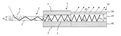 本発明者らは、上記のような特定方向への光の出射が実際に可能であるかを光学解析によって検証した。光学解析は、サイバネット社のDiffractMODを用いた計算によって行った。これは、厳密結合波理論(RCWA:Rigorous Coupled-Wave Analysis)に基づいたシミュレーションであり、波動光学の効果を正確に計算することができる。