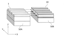図8は、基板50Aの上に作製された複数の第1の導波路1と、別の基板50Bの上に作製された複数の第2の導波路10との接続を模式的に示す図である。2つの基板50A、50Bは、XY平面に平行に配置されている。複数の第1の導波路1および複数の第2の導波路10は、X方向に延び、Y方向に配列されている。第1の導波路1は、例えば、光の全反射を利用する一般的な導波路である。第2の導波路10は、反射型導波路である。別々の基板50A、50Bの上にそれぞれ配置された第1の導波路1および第2の導波路10を位置合わせして接続することによって、第1の導波路1から第2の導波路10へ光を導入することができる。