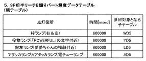 「輝度データが切り替わる」とは、孫テーブルに定められている輝度データのタイマが0となり、その次の輝度データが用いられることを指す。輝度データが切り替わることで、ランプの発光態様が切り替わることである。ランプの発光態様が切り替わることで、遊技者に対して、現在表示されているシーンのストーリー展開が更新されている印象を与える。