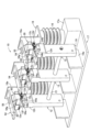 図1に示すように、接地開閉器10は、接離可能に設けられた可動子12及び固定子14を備えている。可動子12及び固定子14は、三相分として3組設けられており、本実施の形態では、3組の可動子12及び固定子14は、概略同一構造が採用される。可動子12及び固定子14は、接触状態(図2参照)で通電(閉路)し、図1に示す離間状態で通電を遮断(開路)するものである。ここで、本実施の形態では、接地開閉器10は空気中(大気中)で電流を遮断する気中開閉器とされ、配電盤の内部等に設置される。