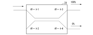 従来、このような課題を解決するため、ドロップ点31として、光信号の分岐比率が最適化された光スプリッタである不等分岐光スプリッタを用いる手法が提案されている(例えば、非特許文献1)。不等分岐光スプリッタとは、各出力ポートにおける透過率が非対称に設定された光スプリッタである。 Conventionally, in order to solve such a problem, a technique has been proposed in which an unequal branching optical splitter, which is an optical splitter with an optimized branching ratio of optical signals, is used as the drop point 31 (see, for example, Non-Patent Document 1 ). A unequal branching optical splitter is an optical splitter in which the transmittance at each output port is set asymmetrically.
