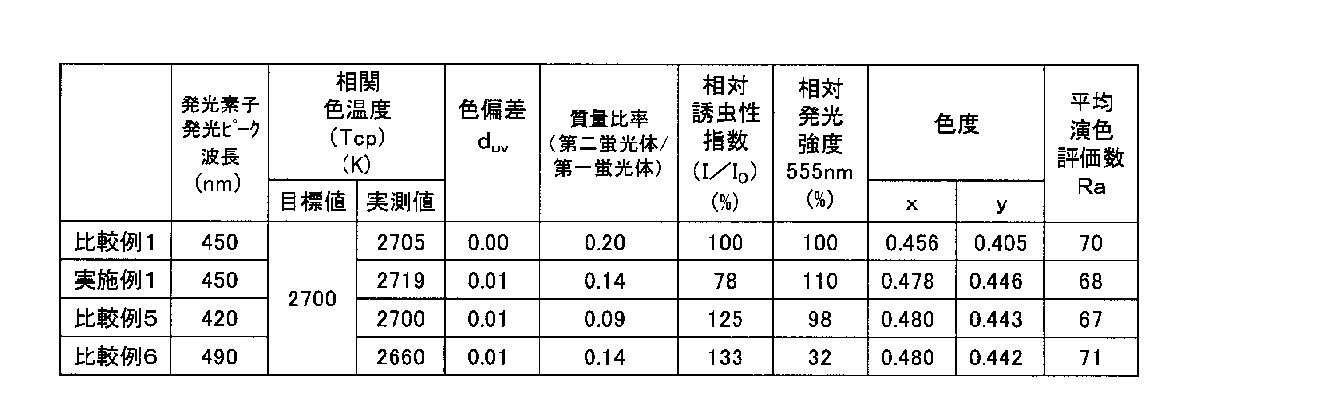 目標とする各相関色温度を有する色偏差duvが0である発光装置から発せられる光の誘虫性指数I0に対する目標とする各相関色温度を有する実施例及び比較例の発光装置から発せられる光の誘虫性指数Iの比率(I/I0×100(%))を相対誘虫性指数(I/I0)(%)として表した。結果を表1から表4に示す。