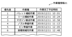 また、作業種情報d1によって示される上述の複数の作業種のそれぞれの優先度は、その作業種の作業完了予定時刻に応じて設定された数値であって、優先度が高いほど、小さい数値を示す。例えば、作業種情報d1では、作業種の作業完了予定時刻が早いほど、その作業種には、高い優先度、すなわち小さい数値が対応付けられている。例えば、図12に示す例では、最も優先度が高い作業は、作業種「パレット補給作業」の作業であり、3番目に優先度が高い作業は、作業種「マガジン搬送作業」の作業である。