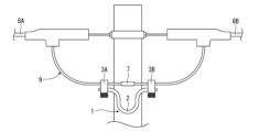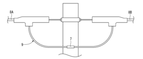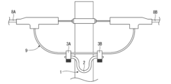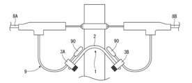 装着工程S1では、図12に示すように、予め芯材2をU字状に曲げておき、縁廻し線9の延在方向の間隔をあけた箇所を第1保持部3Aおよび第2保持部3Bでそれぞれ保持する。次に、切断工程S2では、図13に示すように、縁廻し線9を第1保持部3Aおよび第2保持部3Bの間の箇所で切断する。次に、図14に示すように、向き変更工程S3では、芯材2を可撓変形させたり、第1保持部3Aおよび第2保持部3Bの少なくとも一方を芯材2に対して回転させたりして、縁廻し線9の切断端末91、92同士を離隔すると共に、各端末を所定の向きに向ける。次に、図15に示すように、各切断端末91、92に絶縁性の端末カバー90を装着する。
