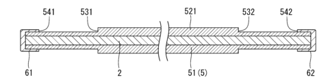 また、図6に示すように、第1保護被覆51は、芯材2とほぼ同じ長さであり、芯材2の長手方向の全域を覆っている。これに対して、第2保護被覆52は、芯材2よりも短く、芯材2の両端部を除く中央部を覆っている。したがって、保護被覆5の両端部では、第1保護被覆51が第2保護被覆52から露出しており、第1保護被覆51の表面と第2保護被覆52の端面とで形成された段差531、532が形成されている。後述するように、電線用工具1では、これら段差531、532に第1保持部3Aおよび第2保持部3Bを突き当てることにより、第1保持部3Aおよび第2保持部3Bの位置を定めている。つまり、保護被覆5は、芯材2を絶縁被覆するだけでなく、第1保持部3Aおよび第2保持部3Bの位置を定める位置決め部としても機能する。そのため、別途、位置決め部を設ける場合と比べて電線用工具1の構成がシンプルとなり、電線用工具1の軽量化や、製造コストの削減を図ることができる。