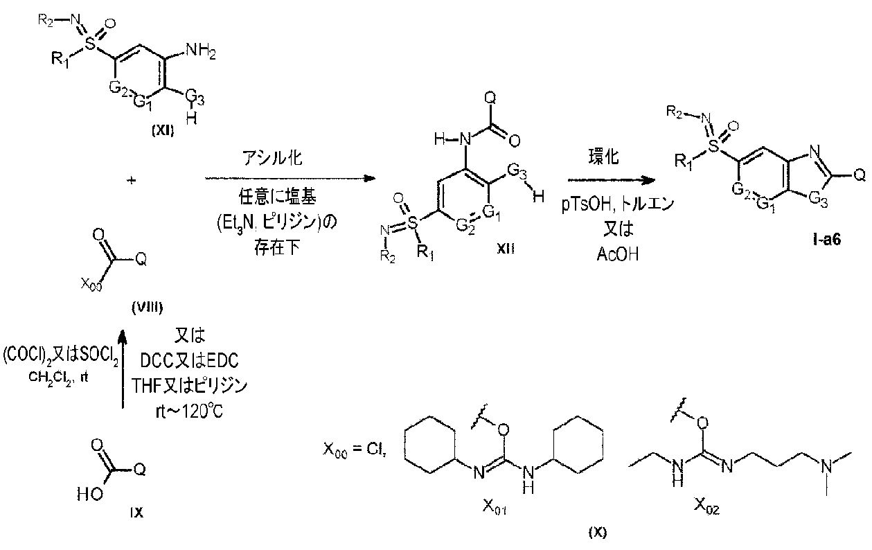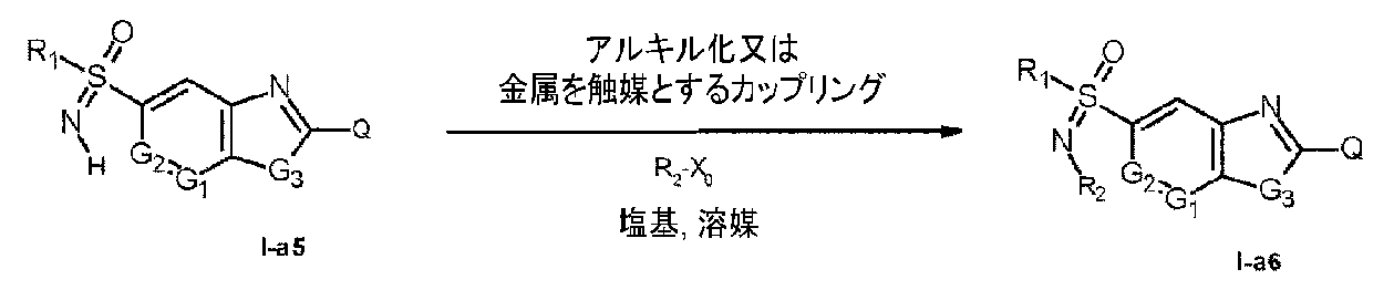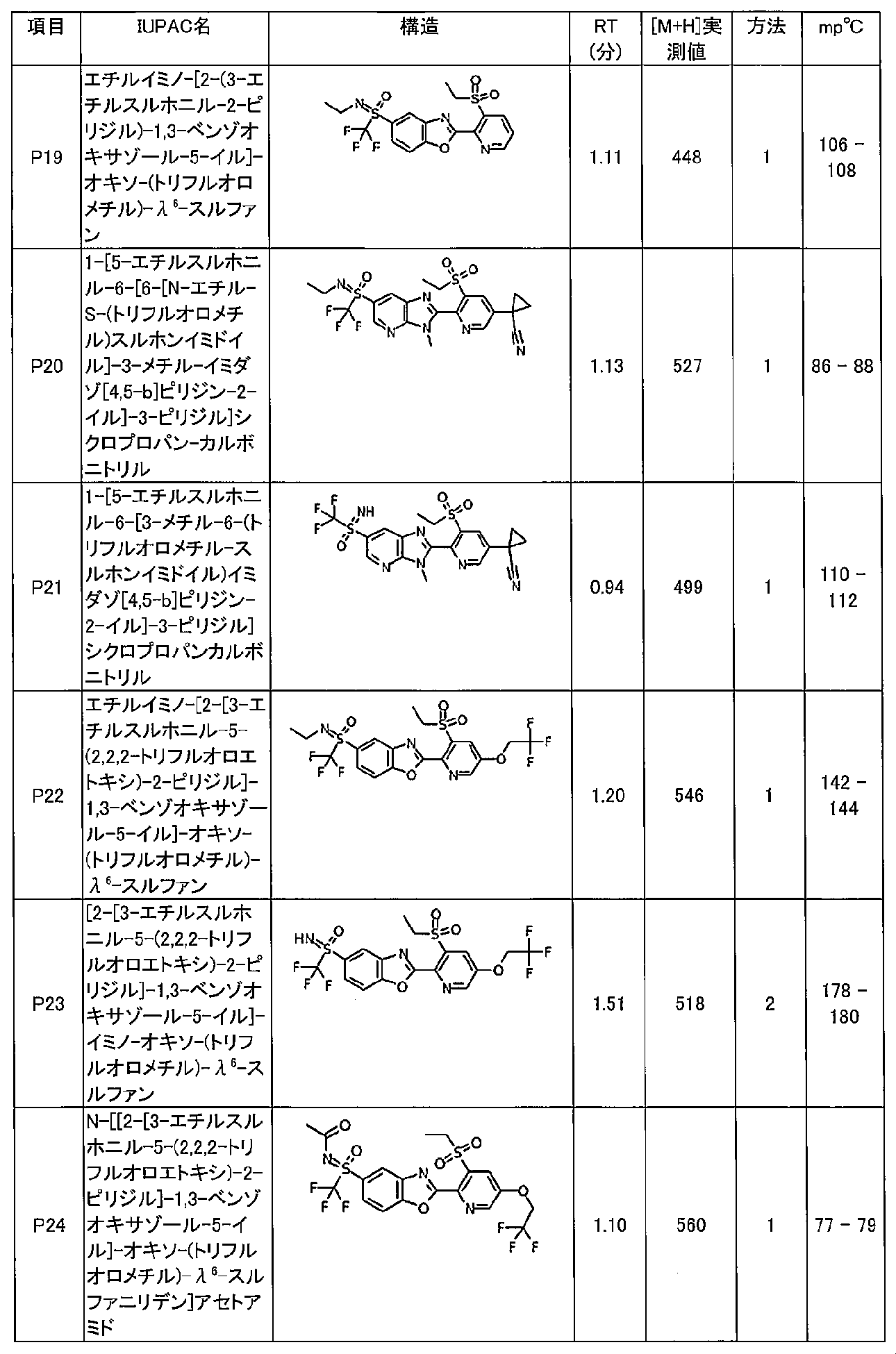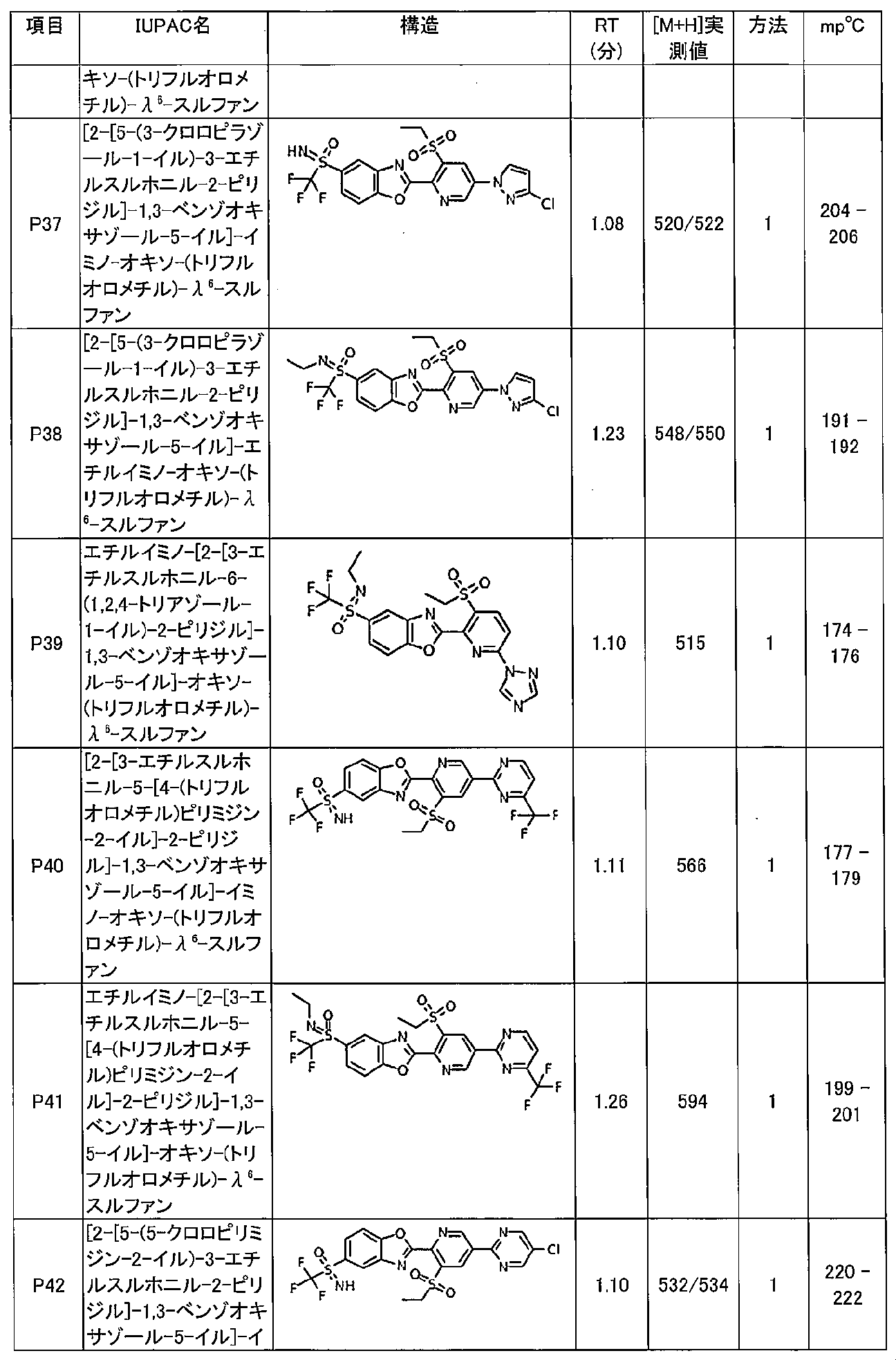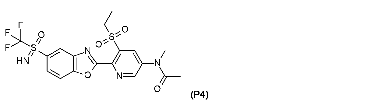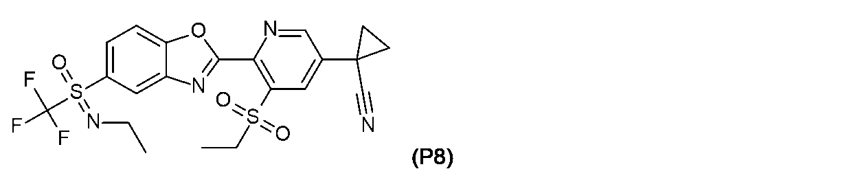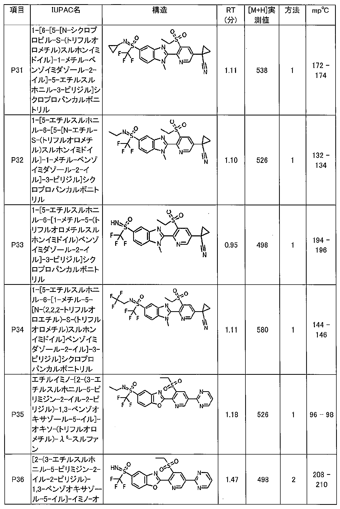 1-[5-エチルスルホニル-6-[1-メチル-5-(トリフルオロメチルスルホンイミドイル)ベンゾイミダゾール-2-イル]-3-ピリジル]シクロプロパンカルボニトリル(上記のように調製した化合物P33)(0.19g、0.38mmol)、ジアセトキシ銅(0.104g、0.57mmol)及びピリジン(0.072g、0.91mmol)の1,4-ジオキサン(3.8mL)溶液を開放空気条件下において室温で5分間撹拌し、それにシクロプロピルボロン酸(0.065g、0.76mmol)を加えた。反応混合物を事前加熱した油浴中、エアバルーン下において3時間100℃で還流させた。反応混合物を室温に冷却し、酢酸エチルで希釈し、蒸留水、それに続いてブライン溶液で洗浄した。有機層を無水硫酸ナトリウムで乾燥させ、真空中で濃縮した。粗生成物をcombiflash(シリカゲル、シクロヘキサン中の酢酸エチル)によって精製し、1-[6-[5-[N-シクロプロピル-S-(トリフルオロメチル)スルホンイミドイル]-1-メチル-ベンゾイミダゾール-2-イル]-5-エチルスルホニル-3-ピリジル]シクロプロパンカルボニトリルを白色の固体として得た。LCMS(方法1):Rt=1.11分、m/z=538(M+H)