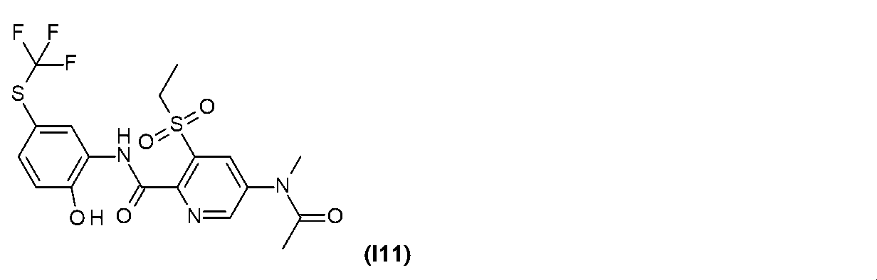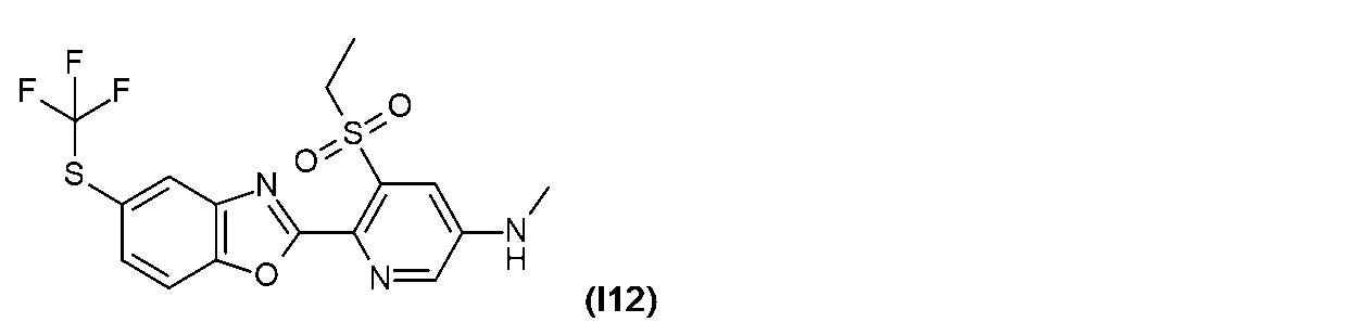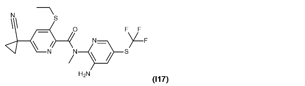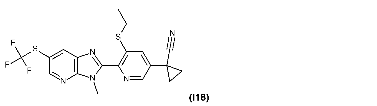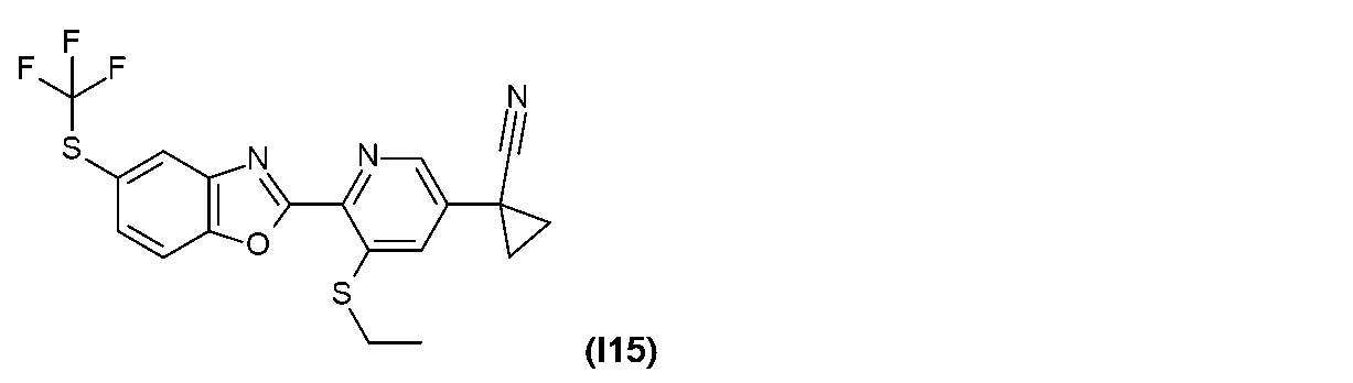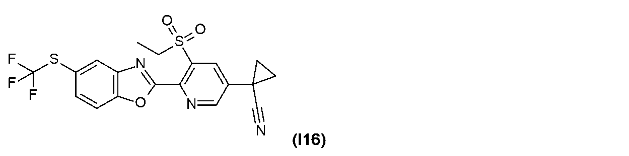 5-(1-シアノシクロプロピル)-3-エチルスルホニル-ピリジン-2-カルボン酸(CAS 1879106-82-7、国際公開第2016/071214号に記載したように調製)(0.50g、1.78mmol)のニトロベンゼン(4mL)溶液にN1-メチル-4-(トリフルオロメチルスルファニル)ベンゼン-1,2-ジアミン(CAS 1383840-98-9)(0.476g、2.14mmol)、それに続いて塩化ホスホリル(0.420mL、4.46mmol)を室温において滴下で添加した。反応混合物を160℃で6時間、それに続いて120℃で16時間撹拌した。完了後、反応混合物を飽和炭酸水素ナトリウム水溶液(50mL)でクエンチし、酢酸エチル(3×50mL)で抽出した。合わせた有機層をブライン(50mL)で洗浄し、無水硫酸ナトリウムで乾燥させ、真空中で濃縮した。粗生成物をcombiflash(シリカゲル、シクロヘキサン中の35%酢酸エチル)によって精製し、1-[5-エチルスルホニル-6-[1-メチル-5-(トリフルオロメチルスルファニル)ベンゾイミダゾール-2-イル]-3-ピリジル]シクロプロパンカルボニトリルを茶色の固体として得た。LCMS(方法1):Rt=1.10分、m/z=468(M+H)