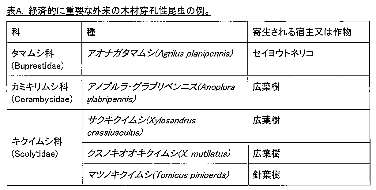 アセテート+TX、ドデカ-8+TX、10-ジエン-1-イルアセテート+TX、ドミニカルア+TX、エチル4-メチルオクタノエート+TX、ユージノール+TX、フロンタリン+TX、グランドルア+TX、グランドルアI+TX、グランドルアII+TX、グランドルアIII+TX、グランドルアIV+TX、ヘキサルア+TX、イプスジエノール+TX、イプセノール+TX、ジャポニルア+TX、リネアチン+TX、リトルア+TX、ループルア+TX、メドルア+TX、メガトモ酸+TX、メチルユージノール+TX、ムスカルア+TX、オクタデカ-2,13-ジエン-1-イルアセテート+TX、オクタデカ-3,13-ジエン-1-イルアセテート+TX、オルフラルア+TX、オリクタルア+TX、オストラモン+TX、シグルア+TX、ソルジジン+TX、スルカトール+TX、テトラデカ-11-エン-1-イルアセテート+TX、トリメドルア+TX、トリメドルアA+TX、トリメドルアB1+TX、トリメドルアB2+TX、トリメドルアC+TX、トランク-コール+TX、2-(オクチルチオ)-エタノール+TX、ブトピロノキシル+TX、ブトキシ(ポリプロピレングリコール)+TX、アジピン酸ジブチル+TX、フタル酸ジブチル+TX、コハク酸ジブチル+TX、ジエチルトルアミド+TX、ジメチルカルベート+TX、フタル酸ジメチル+TX、エチルヘキサンジオール+TX、ヘキサアミド+TX、メトキン-ブチル+TX、メチルネオデカンアミド+TX、オキサメート+TX、ピカリジン+TX、1-ジクロロ-1-ニトロエタン+TX、1,1-ジクロロ-2,2-ビス(4-エチルフェニル)エタン+TX、1,2-ジクロロプロパン及び1,3-ジクロロプロペン+TX、1-ブロモ-2-クロロエタン+TX、2,2,2-トリクロロ-1-(3,4-ジクロロフェニル)エチルアセテート+TX、2,2-ジクロロビニル2-エチルスルフィニルエチルメチルホスフェート+TX、2-(1,3-ジチオラン-2-イル)フェニルジメチルカルバメート+TX、2-(2-ブトキシエトキシ)エチルチオシアネート+TX、2-(4,5-ジメチル-1,3-ジオキソラン-2-イル)フェニルメチルカルバメート+TX、2-(4-クロロ-3,5-キシリルオキシ)エタノール+TX、2-クロロビニルジエチルホスフェート+TX、2-イミダゾリドン+TX、2-イソバレリルインダン-1,3-ジオン+TX、2-メチル(プロパ-2-イニル)アミノフェニルメチルカルバメート+TX、2-チオシアナトエチルラウレート+TX、3-ブロモ-1-クロロプロパ-1-エン+TX、3-メチル-1-フェニルピラゾール-5-イルジメチルカルバメート+TX、4-メチル(プロパ-2-イニル)アミノ-3,5-キシリルメチルカルバメート+TX、5,5-ジメチル-3-オキソシクロヘキサ-1-エニルジメチルカルバメート+TX、アセチオン+TX、アクリロニトリル+TX、アルドリン+TX、アロサミジン+TX、アリキシカルブ+TX、アルファ-エクジソン+TX、リン化アルミニウム+TX、アミノカルブ+TX、アナバシン+TX、アチダチオン+TX、アザメチホス+TX、バチルス・チューリンゲンシス(Bacillus thuringiensis)デルタ内毒素+TX、ヘキサフルオロケイ酸バリウム+TX、バ多硫化バリウム+TX、バルトリン+TX、Bayer 22/190+TX、Bayer 22408+TX、ベータ-シフルトリン+TX、ベータ-シペルメトリン+TX、ビオエタノメトリン+TX、ビオペルメトリン+TX、ビス(2-クロロエチル)エーテル+TX、ホウ砂+TX、ブロムフェンビンホス+TX、ブロモ-DDT+TX、ブフェンカルブ+TX、ブタカルブ+TX、ブタチオホス+TX、ブトナート+TX、ヒ酸カルシウム+TX、シアン化カルシウム+TX、二硫化炭素+TX、四塩化炭素+TX、カルタップ塩酸塩+TX、セバジン+TX、クロルビシクレン+TX、クロルデン+TX、クロルデコン+TX、クロロホルム+TX、クロロピクリン+TX、クロルホキシム+TX、クロルプラゾホス+TX、シス-レスメトリン+TX、シスメトリン+TX、クロシトリン+TX、アセト亜ヒ酸銅+TX、ヒ酸銅+TX、オレイン酸銅+TX、クミトエート+TX、氷晶石+TX、CS 708+TX、シアノフェンホス+TX、シアノホス+TX、シクレトリン+TX、サイチオアート+TX、d-テトラメトリン+TX、DAEP+TX、ダゾメット+TX、デカルボフラン+TX、ジアミダホス+TX、ジカプトン+TX、ジクロフェンチオン+TX、ジクレシル+TX、ジシクラニル+TX、ジエルドリン+TX、ジエチル5-メチルピラゾール-3-イルホスフェート+TX、ジロール+TX、ジメフルトリン+TX、ジメタン+TX、ジメトリン+TX、ジメチルビンホス+TX、ジメチラン+TX、ジノプロプ+TX、ジノサム+TX、ジノセブ+TX、ジオフェノラン+TX、ジオキサベンゾホス+TX、ジチクロホス+TX、DSP+TX、エクジステロン+TX、EI 1642+TX、EMPC+TX、EPBP+TX、エタホス+TX、エチオフェンカルブ+TX、ギ酸エチル+TX、二臭化エチレン+TX、二塩化エチレン+TX、エチレンオキシド+TX、EXD+TX、フェンクロルホス+TX、フェネタカルブ+TX、フェニトロチオン+TX、フェノキサクリム+TX、フェンピリトリン+TX、フェンスルホチオン+TX、フェンチオン-エチル+TX、フルコフロン+TX、ホスメチラン+TX、ホスピラート+TX、ホスチエタン+TX、フラチオカルブ+TX、フレトリン+TX、グアザチン+TX、酢酸グアザチン+TX、テトラチオ炭酸ナトリウム+TX、ハルフェンプロックス+TX、HCH+TX、HEOD+TX、ヘプタクロール+TX、ヘテロホス+TX、HHDN+TX、シアン化水素+TX、ヒキンカルブ+TX、IPSP+TX、イサザホス+TX、イソベンザン+TX、イソドリン+TX、イソフェンホス+TX、イソラン+TX、イソプロチオラン+TX、イソオキサチオン+TX、幼若ホルモンI+TX、幼若ホルモンII+TX、幼若ホルモンIII+TX、ケ