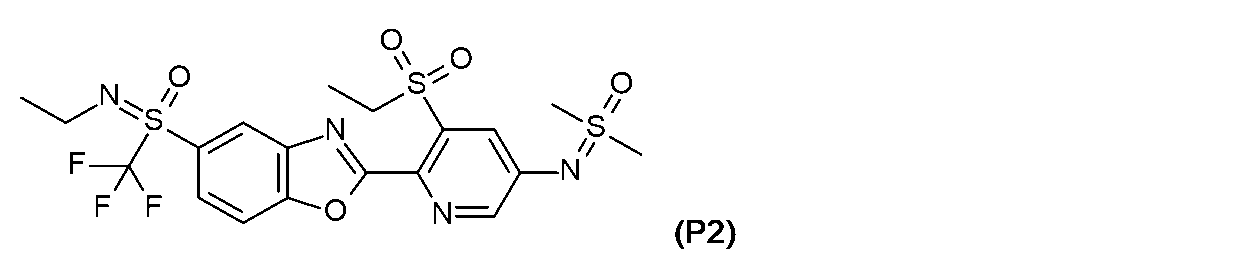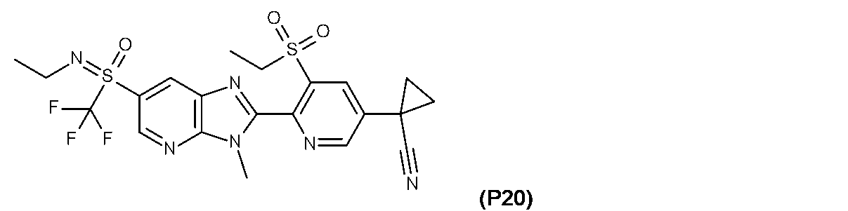 1-[5-エチルスルホニル-6-[1-メチル-5-(トリフルオロメチルスルホンイミドイル)ベンゾイミダゾール-2-イル]-3-ピリジル]シクロプロパンカルボニトリル(上記のように調製した化合物P33)(0.22g、0.442mmol)のN,N-ジメチルホルムアミド(2.0mL)溶液に炭酸カリウム(0.18g、1.32mmol)、それに続いてヨードエタン(0.10g、0.66mmol)を加えた。反応塊を室温で16時間撹拌し、次いで氷冷水でクエンチし、酢酸エチル(2×20mL)で抽出した。合わせた有機層を硫酸ナトリウムで乾燥させ、濾過し、真空中で濃縮した。粗生成物をcombiflash(シリカゲル、シクロヘキサン中の30%酢酸エチル)によって精製し、1-[5-エチルスルホニル-6-[5-[N-エチル-S-(トリフルオロメチル)スルホンイミドイル]-1-メチル-ベンゾイミダゾール-2-イル]-3-ピリジル]シクロプロパンカルボニトリルを白色の固体として得た。LCMS(方法1):Rt=1.10分、m/z=526(M+H)