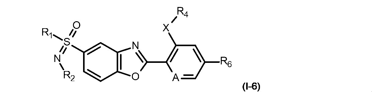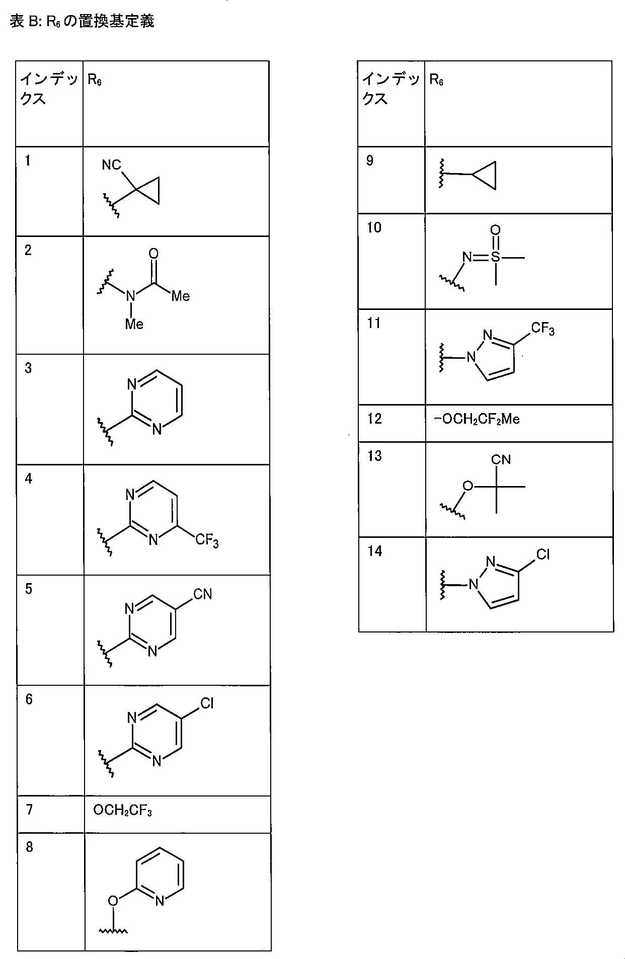 最も好ましくは、R6は、シクロプロピル、1-シアノシクロプロピル、2,2,2-トリフルオロエトキシ、2,2-ジフルオロプロポキシ、1-シアノ-1-メチル-エトキシ、-N=S(O)(CH3)2、-N(CH3)COCH3、2-ピリジルオキシ、ピリミジン-2-イル、4-トリフルオロメチル-ピリミジン-2-イル、5-シアノ-ピリミジン-2-イル、5-クロロ-ピリミジン-2-イル、3-クロロ-ピラゾール-1-イル、3-トリフルオロメチル-ピラゾール-1-イルである。