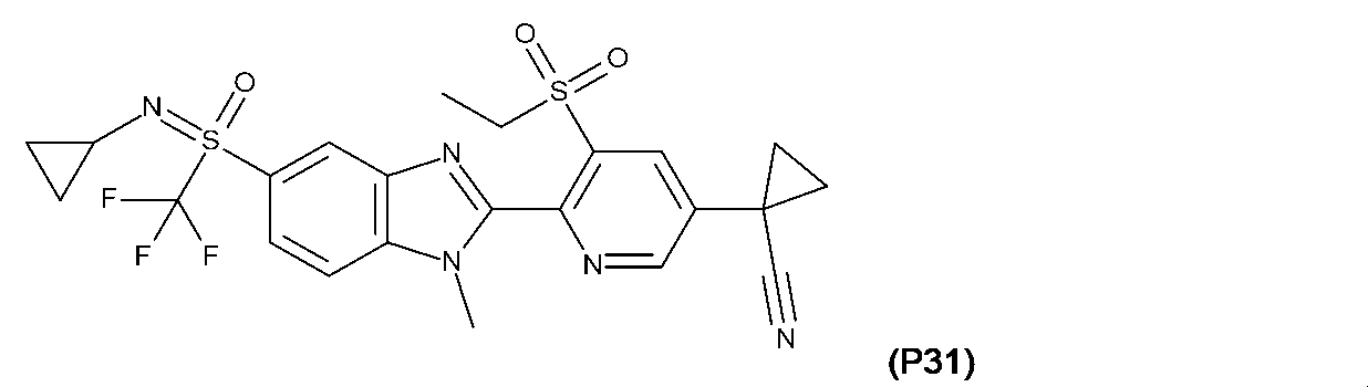 実施例P31:1-[6-[5-[N-シクロプロピル-S-(トリフルオロメチル)スルホンイミドイル]-1-メチル-ベンゾイミダゾール-2-イル]-5-エチルスルホニル-3-ピリジル]シクロプロパンカルボニトリル(化合物P31)の調製