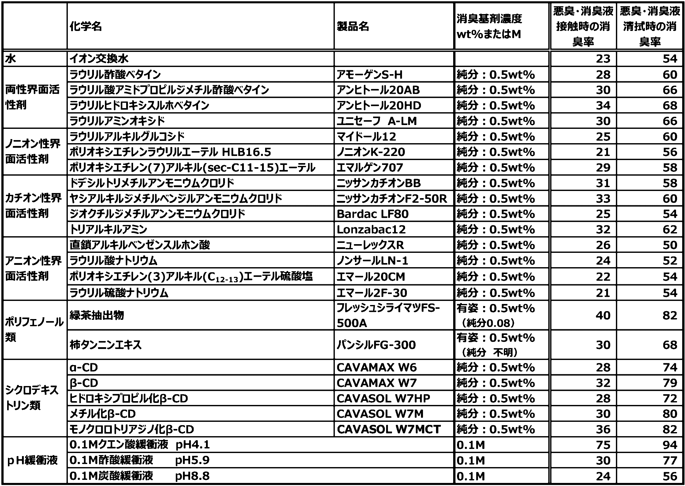 両性界面活性剤:ラウリル酢酸ベタインは第一工業製薬株式会社製のアモーゲンS-Hを、ラウリルアミンオキシドは日油株式会社製のユニセーフA-LMを用いた。