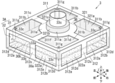筐体3Aは、フレーム31、及び閉塞体32を備えて、中空の矩形箱状に形成される。筐体3Aの下面には、矩形状の開口が送風口30aとして形成されている。送風口30aは、X-Y平面(X軸及びY軸で規定される平面)に沿った矩形状の平面であり、この送風口30aの軸方向はZ軸に沿った方向となる。