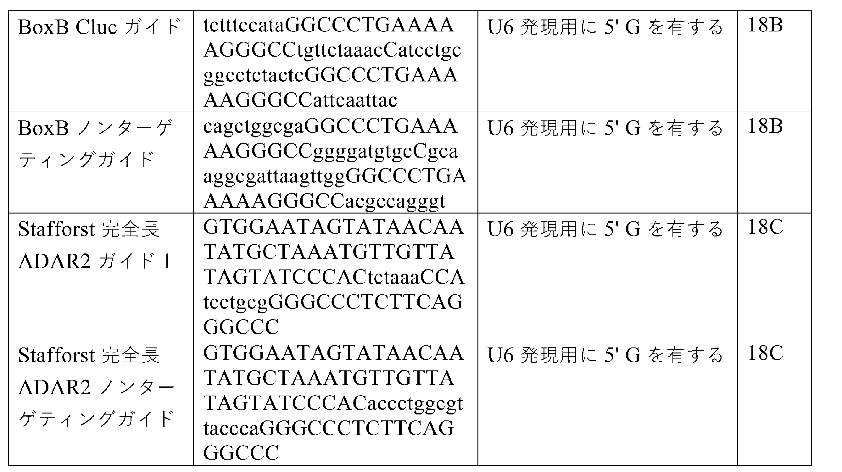 Cas13ターゲティングの高い特異性を踏まえて、本発明者らは、オフターゲットがADARから生じ得ることが妥当と考えた。2つのRNA誘導型ADAR系が以前記載されている(図16A)。第1のものは、ADAR2DDと、BoxB-λ RNAヘアピンに結合する低分子ウイルスタンパク質ラムダN(λN)との融合物を利用する(22)。二重BoxB-λヘアピンを有するガイドRNAが、ガイドRNAにコードされた編集部位にADAR2DDを誘導する(23)。第2の設計は完全長ADAR2(ADAR2)と、ADAR2の二本鎖RNA結合ドメイン(dsRBD)が認識するヘアピンを有するガイドRNAとを利用する(21、24)。本発明者らは、REPAIRv1と比較したこれらの2つの系の編集効率を分析し、REPAIRv1によって達成された89%の編集率と比較して、BoxB-ADAR2及びADAR2系がそれぞれ63%及び36%の編集率を実証したことを見出した(図16B~図16E)。加えて、BoxB及びADAR2系は、REPAIRv1ターゲティングガイド条件での1,229個のオフターゲットと比較して、ターゲティングガイド条件でそれぞれ2018個及び174個の観察されたオフターゲットを作り出した。特に、ADAR2系は大部分が異なるオフターゲットの組を有した一方、2つのADAR2DDベースの系(REPAIRv1及びBoxB)を含む条件の全ては、そのオフターゲットに高い割合の重複を示した(図16F)。ターゲティング条件とノンターゲティング条件との間及びREPAIRv1条件とBoxB条件との間のオフターゲットの重複は、ADAR2DDがdCas13ターゲティングと無関係にオフターゲットをドライブしたことを示唆している(図16F)。