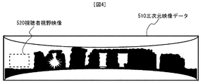 本実施例による三次元ヘッドマウントディスプレイ用の映像表示プログラムを適用する映像表示システムは、前述したように三次元ヘッドマウントディスプレイを用いた三次元コンテンツ視聴中に発生する映像酔い(頭痛・眩暈(平衡感覚の異常)・吐き気・悪心等の乗り物酔いに似た症状)を防止又は低減するものである。この映像酔いとは、ユーザへの視野画面として例えば図6上段に示した室内に本棚41及びテレビ43が配置され、これに間に人物42が起立している状態を正面右斜めから見た三次元画像データS1を表示させた状態から、ユーザ15が頭をゆっくり動かしたときにジャイロセンサ・加速度センサ・角加速度センサなどを含む姿勢センサにより頭部の動きを検出したソフトウェアが急激に画面を左方(矢印A方向)にパンして人物42の左後方から見た三次元映像データSnに移動させた場合、この三次元映像データS1から三次元映像データSnの間には多数の三次元映像データが存在し、この連続表示される映像を見たユーザ15がめまい等の映像酔いを感じるためと思われる。特に三次元ヘッドマウントディスプレイを用いた三次元画像データは、仮想空間を三次元的にユーザに見せるために、例えば図4に示す如き左右の幅が広大な三次元映像データ510を用意しておき、ソフトウェアが、この三次元映像データ510から一部を抽出した視聴者視野映像520の範囲をユーザに提供し、三次元映像データ510の左側の視聴者視野映像520の範囲を右端側に急激に動くように表示させた場合、ユーザに映像酔いを発生させる可能性が大きい。