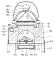 제2용기(230)는 제1용기(210)와 마찬가지로 황토를 재료로 성형 소성한 돔형상의 천정을 갖는 뚜껑 형상으로, 제1용기(210)의 개방된 상면을 덮도록 얹혀진다. 제2용기(230)는 대류현상이 원활하게 이루어지게 하고, 제1용기(210)의 내부 온도 의 조절을 가능하게 하는 제1연통(240)을 갖는다. 제1연통(240)에는 필요에 따라 배기량을 조절할 수 있도록 하는 조절판(미도시됨)이 형성된 커버(242)가 설치된다. 제2용기(230)에는 내부 온도를 체크하기 위한 온도계(250)가 설치된다. Like the