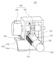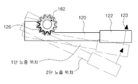 직선 이동 구동 장치(140)는 직선 이동 구동 기어(142)와 구동 모터(144)를 구비하여 이루어지고, 회전 이동 구동 장치(160)는 회전 이동 구동 기어(162)와 구동 모터(164)를 구비하여 이루어진다. 직선 이동 구동 기어(142)와 회전 이동 구동 기어(162)는 각각의 구동 모터(144, 164)에 의해 구동되며, 각각의 피동 기어(124, 126)를 구동하도록 구성된다.The linear