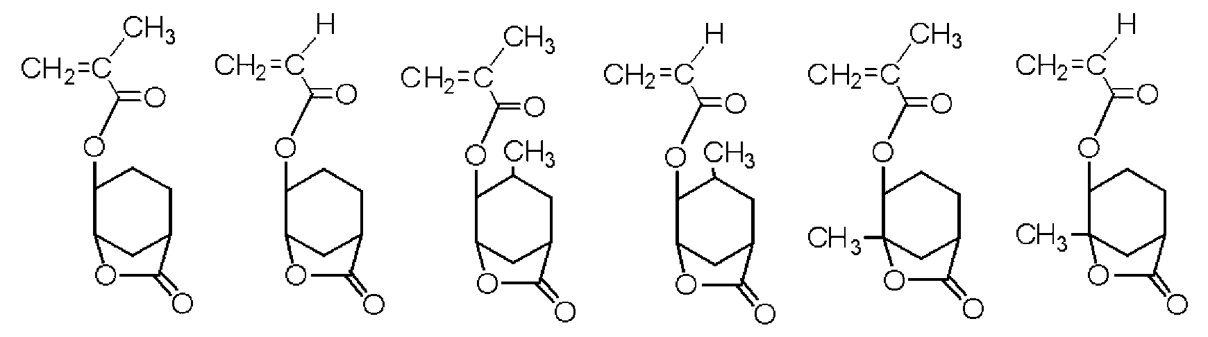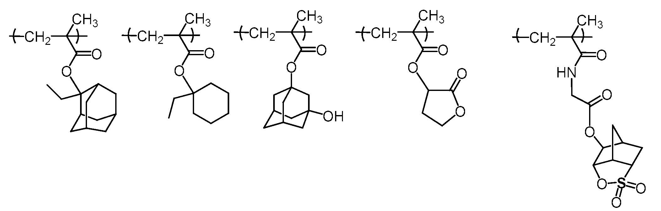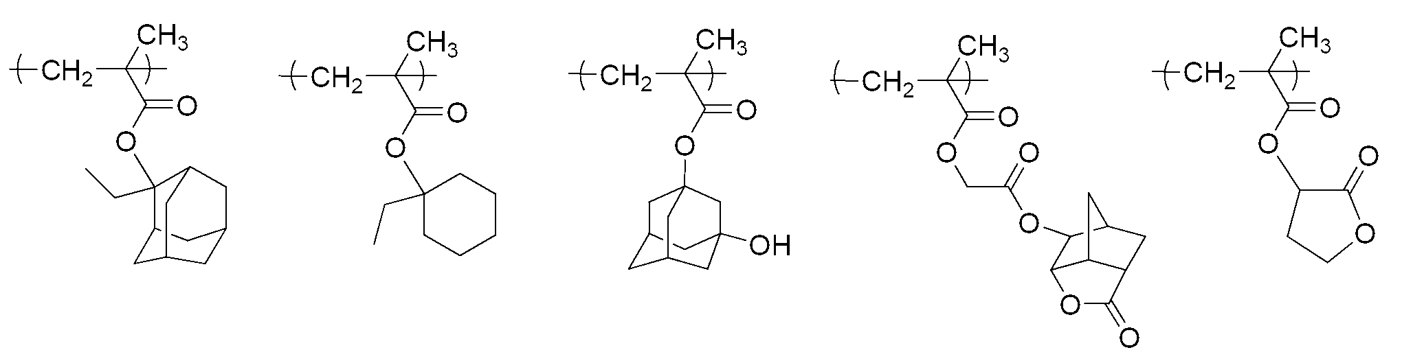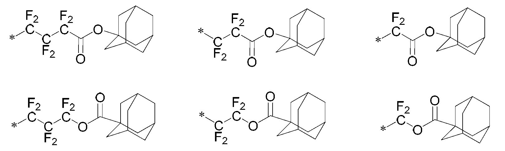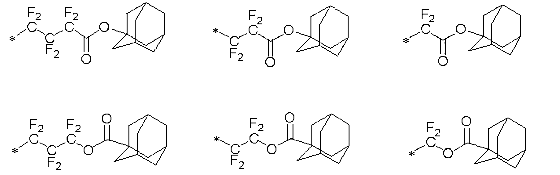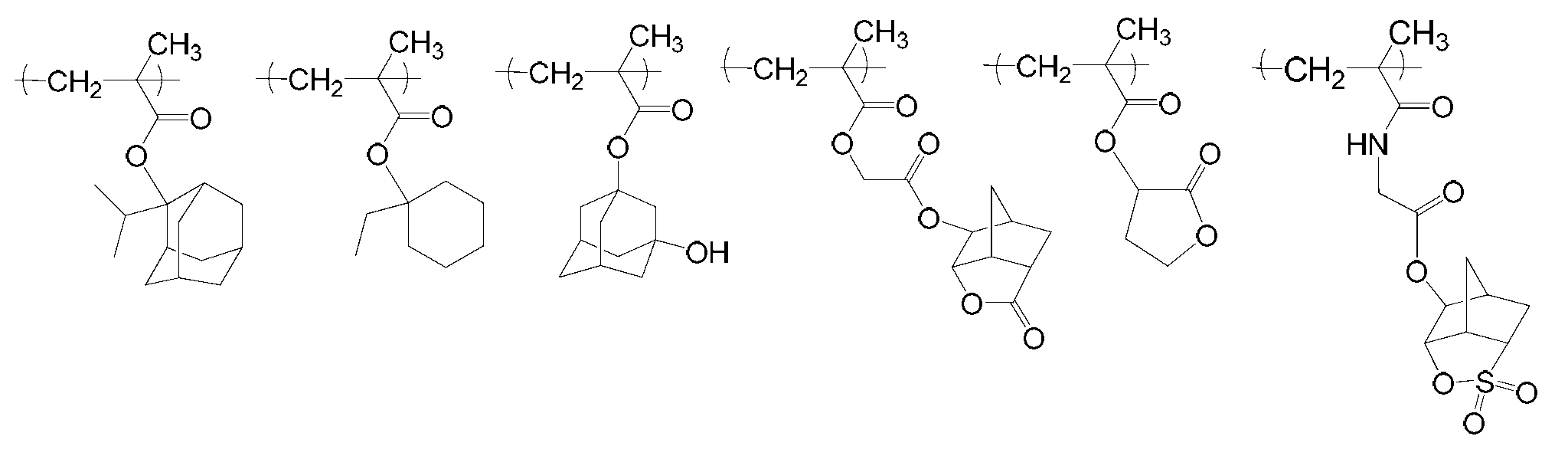 단량체 (E), 단량체 (K), 단량체 (F), 단량체 (H) 및 단량체 (G)를 몰비 단량체 (E):단량체 (K):단량체 (F):단량체 (H):단량체 (G) = 32:7:8:10:43으로 함께 혼합하고, 여기에 디옥산을 단량체 총량의 1.5 중량배의 양으로 첨가하여 용액을 얻었다. 얻어진 용액에 아조비스이소부티로니트릴 및 아조비스(2,4-디메틸발레로니트릴)을 개시제로서 단량체 전량에 대하여 각각 1 몰% 및 3 몰%의 양으로 첨가하고, 얻어진 혼합물을 73℃에서 약 5시간 동안 가열하였다. 그 후, 얻어진 반응 혼합물을 대량의 메탄올과 물의 혼합물에 부어 수지를 침전시켰다. 얻어진 수지를 여과하였다. 이렇게 얻어진 수지를 또다른 디옥산에 용해시켜 용액을 얻고, 용액을 메탄올과 이온교환수의 혼합물에 부어 수지를 침전시켰다. 얻어진 수지를 여과하였다. 마지막 두 문장에 기재된 이들 조작을 2회 반복하여, 중량 평균 분자량이 약 8900인 공중합체를 78% 수율로 얻었다. 하기 화학식의 단량체로부터 유도되는 구조 단위를 갖는 이 공중합체를 수지 A6으로 하였다.