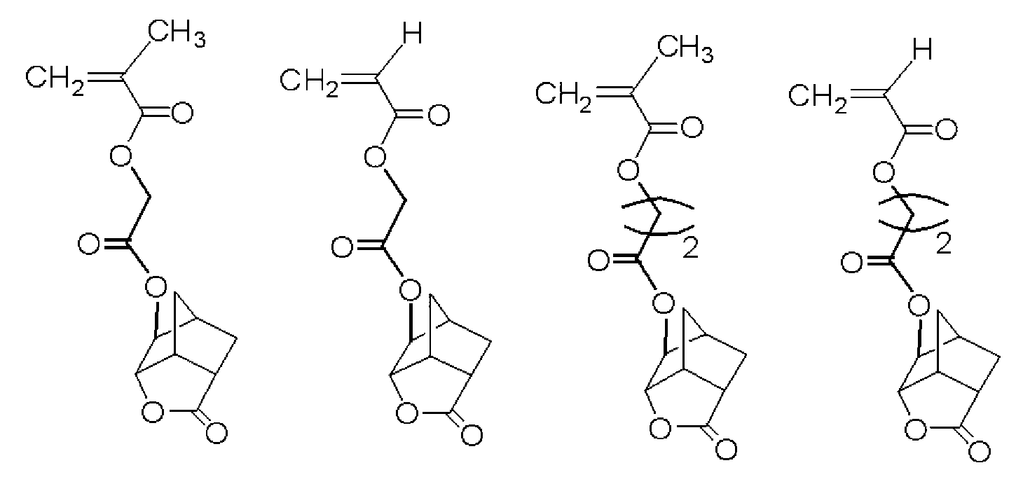 단량체 (I) 및 단량체 (M)을 몰비 단량체 (I):단량체 (M) = 50:50으로 함께 혼합하고, 여기에 디옥산을 단량체 총량의 1.5 중량배의 양으로 첨가하여 용액을 얻었다. 얻어진 용액에 아조비스이소부티로니트릴 및 아조비스(2,4-디메틸발레로니트릴)을 개시제로서 단량체 전량에 대하여 각각 0.7 몰% 및 2.1 몰%의 양으로 첨가하고, 얻어진 혼합물을 75℃에서 약 5시간 동안 가열하였다. 그 후, 얻어진 반응 혼합물을 대량의 메탄올과 물의 혼합물에 부어 수지를 침전시켰다. 얻어진 수지를 여과하였다. 이렇게 얻어진 수지를 또다른 디옥산에 용해시켜 용액을 얻고, 용액을 메탄올과 물의 혼합물에 부어 수지를 침전시켰다. 얻어진 수지를 여과하였다. 마지막 두 문장에 기재된 이들 조작을 2회 반복하여, 중량 평균 분자량이 약 17000인 공중합체를 68% 수율로 얻었다. 하기 화학식의 단량체로부터 유도되는 구조 단위를 갖는 이 공중합체를 수지 A4로 하였다.