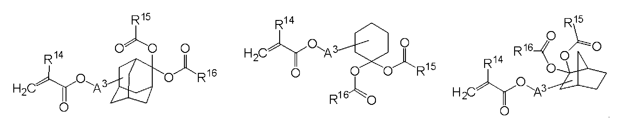 단량체 (O) 및 단량체 (R)을 몰비 단량체 (O):단량체 (R) = 90:10으로 함께 혼합하고, 여기에 디옥산을 단량체 총량의 1.5 중량배의 양으로 첨가하여 용액을 얻었다. 얻어진 용액에 아조비스이소부티로니트릴 및 아조비스(2,4-디메틸발레로니트릴)을 개시제로서 단량체 전량에 대하여 각각 0.7 몰% 및 2.1 몰%의 양으로 첨가하고, 얻어진 혼합물을 75℃에서 약 5시간 동안 가열하였다. 그 후, 얻어진 반응 혼합물을 대량의 메탄올과 물의 혼합물에 부어 수지를 침전시켰다. 얻어진 수지를 여과하였다. 이렇게 얻어진 수지를 또다른 디옥산에 용해시켜 용액을 얻고, 용액을 메탄올과 물의 혼합물에 부어 수지를 침전시켰다. 얻어진 수지를 여과하였다. 마지막 두 문장에 기재된 이들 조작을 2회 반복하여, 중량 평균 분자량이 약 17000인 공중합체를 80% 수율로 얻었다. 하기 화학식의 단량체로부터 유도되는 구조 단위를 갖는 이 공중합체를 수지 A14로 하였다.