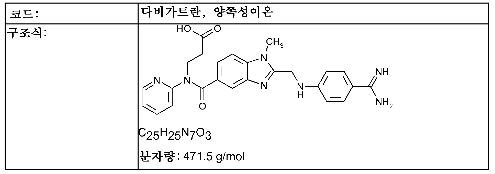 - YBSJFWOBGCMAKL-UHFFFAOYSA-N dabigatran Chemical compound N=1C2=CC(C(=O)N(CCC(O)=O)C=3N=CC=CC=3)=CC=C2N(C)C=1CNC1=CC=C(C(N)=N)C=C1 YBSJFWOBGCMAKL-UHFFFAOYSA-N 0.000 claims abstract description 203