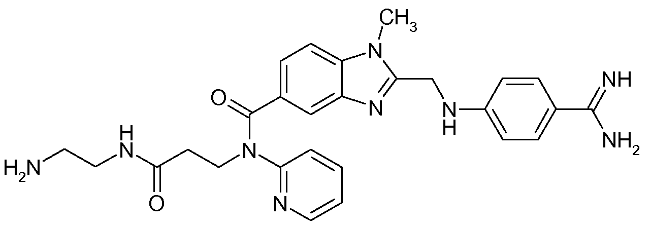 - RSBLCNUTBHRFOJ-UHFFFAOYSA-N 3-[[2-[(4-carbamimidoyl-n-methylanilino)methyl]-1-methylbenzimidazole-5-carbonyl]-pyridin-2-ylamino]propanoic acid Chemical compound C=1C=C(C(N)=N)C=CC=1N(C)CC(N(C1=CC=2)C)=NC1=CC=2C(=O)N(CCC(O)=O)C1=CC=CC=N1 RSBLCNUTBHRFOJ-UHFFFAOYSA-N 0.000 claims description 3