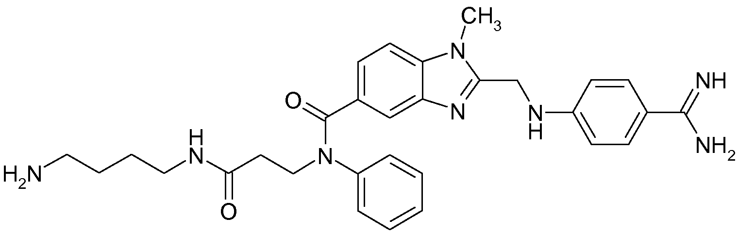 - FCWNQJVQCGUMAT-UHFFFAOYSA-N 3-(n-[2-[(4-carbamimidoyl-n-methylanilino)methyl]-1-methylbenzimidazole-5-carbonyl]anilino)propanoic acid Chemical compound C=1C=C(C(N)=N)C=CC=1N(C)CC(N(C1=CC=2)C)=NC1=CC=2C(=O)N(CCC(O)=O)C1=CC=CC=C1 FCWNQJVQCGUMAT-UHFFFAOYSA-N 0.000 claims description 3