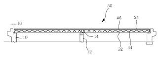 상기 프리스트레스트합성트러스거더(50)는 도 3a 및 도 3b에 도시된 바와 같이, 합성 및 비합성시에 발생하는 인장력에 저항하면서 합성상태에서의 처짐을 감소시킬 수 있도록 프리스트레스가 도입된 프리스트레스트 콘크리트로 이루어지며, 소정형상의 종횡 단면과 소정길이를 가진 철근PSC하현재(52)와 전단력에 저항하고, 상기 철근PSC하현재(52)의 상면에 교번적으로 설치되는 수직 및 경사 강복부재(44)와 상기 강복부재(44) 상면에 철근콘크리트 바닥판(24)이 합성되기 전 상태에서 발생되는 압축력에 저항할 수 있도록 상기 철근PSC하현재(52)의 길이방향을 따라 설치되는 강상현재(46)로 구성되는 골조 형상을 이루고, 상기 강상현재(46) 상면과 내면에 철근콘크리트 바닥판(24)이 합성되어 프리스트레스트합성트러스거더(50) 구조를 가지도록 한 것이다.As shown in FIGS. 3A and 3B, the prestressed