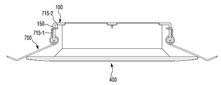 탄성 부재(700)는, 제1 실시 형태에 따른 조명 장치가 설치되는 천청의 상면을 누른다. 즉, 천장이 탄성 부재(700)와 바디(400)의 제3 바디(450) 사이에 배치된다. 탄성 부재(700)는 제3 바디(450) 측으로 탄성력이 작용되기 때문에, 제1 실시 형태에 따른 조명 장치가 천장에 단단히 고정될 수 있다.