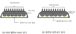 (2) FR-4 PCB 스루 홀의 에폭시 층에 동 박막을 형성함으로써, 열전도성이 매우 높은 다이아몬드 파우더, 메탈, 고분자 등의 혼합 조성물과의 밀착성과 기밀성 유지로 접촉부분의 열저항값을 최소화시켜 열전도성을 높일 수 있다.(2) By forming a copper thin film on the epoxy layer of the FR-4 PCB through hole, the thermal resistance value of the contact portion can be minimized by maintaining the adhesion and airtightness with the mixed composition of diamond powder, metal, The city can be increased.