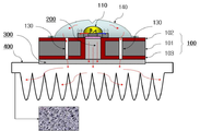 (4) 그래핀 나노-월이 성장된 기판을 채택함으로써, 실제 히트싱크 중간에 공기층이 없도록 게재시킬 경우, 고효율 LED 칩으로부터 발생되는 고열을 상대적인 냉각부하를 갖는 LED 패키지의 가장자리 혹은 외부 방열판으로 신속히 방열시킬 수 있기 때문에 LED 패키지의 발광 효율 극대화하고 수명을 연장할 수 있다.(4) By adopting the graphene nano-wall grown substrate, the high heat generated from the high efficiency LED chip can be quickly transferred to the edge of the LED package having the relative cooling load or the external heat sink It is possible to maximize the luminous efficiency of the LED package and prolong its service life.